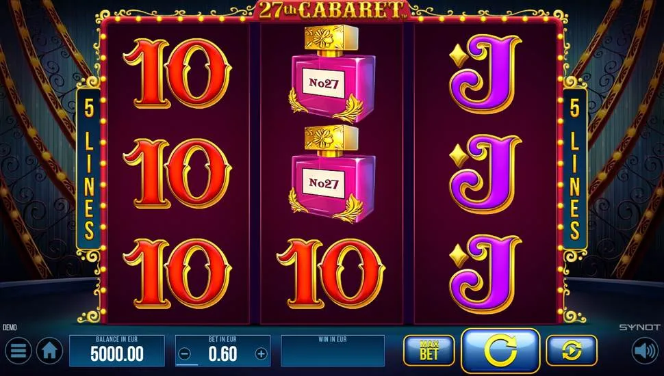 Play 27th Cabaret free online by Synot. Enjoy this classic slot with 98.02% RTP, medium volatility. Instant demo play in your browser.
